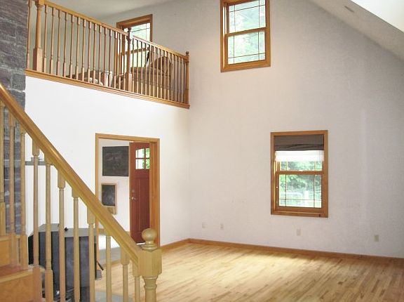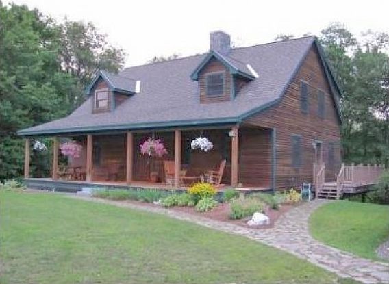 A newer, MUST SEE Country Cape on 2 acres of land! Home offers quality construction w/ exposed woodwork and vaulted ceilings, 2nd story windows, and lofted den over the LR, for a wide-open feel. Striking, field stone chimney with pellet stove and attractive mantle features prominently. Home has 3 BR/2BA. Large master suite w/dual closets, tiled dual-head shower and jacuzzi tub. Laundry area in 1st FL BA. Wide-open kitchen/dining area w/breakfast bar island,Corian counters, and hickory cabinets. Home plumbed for A/C. 1st level has radiant floor heating along with tile and hardwood floors. Full basement walkout to backyard and smaller 3rd bay garage area for ease of access. Large, detached 2 car garage has features such as water and sink, walk-up storage, and a partitioned area for additional storage or utility room. Private, fenced-in back yard and expansive front yard. Large, inviting front farmers porch to enjoy evenings outside. Country setting, yet in-town home!