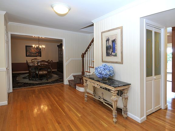 Remarkable blend of house and property with circular drive. Pristine Colonial with welcoming rocking chair front porch on private acre with fabulous in-ground pool. Spacious interior highlighted by elegant formal rooms; luxurious main level master suite with sitting room, fireplace, and spa master bath; gourmet kitchen, sun-drenched family room with woodstove; finished lower level with door out. Two-level deck overlooks large backyard with vista-like views, verdant gardens and specimen trees.