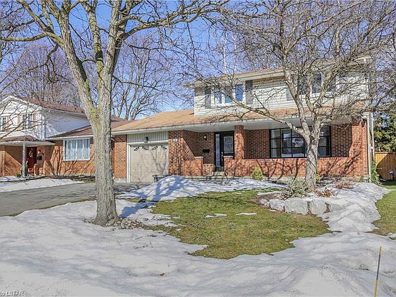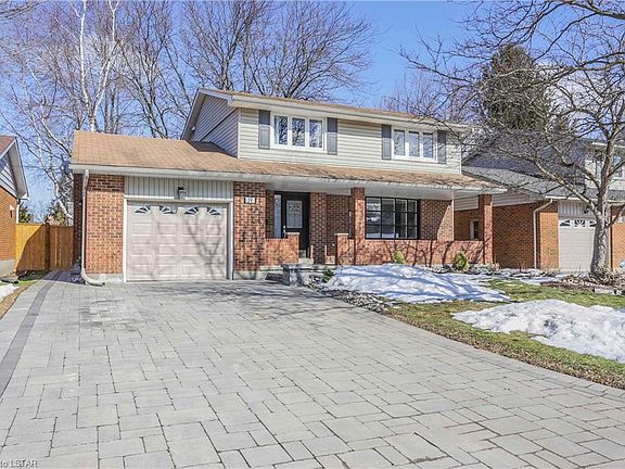 On a quiet, tree lined street, this updated two storey is one you'll be proud to call home. Patio stone double driveway makes a great first impression. Covered porch offers a warm welcome and a perfect place to watch the kids ride their bikes or enjoy a cup of morning coffee. Foyer with ceramic tile leads to bright living room with bay window and hard surface flooring. Your dream kitchen awaits: large island with granite counter, plenty of cabinetry, stainless steel appliances, wine storage, sink overlooking the backyard and spacious dining room with patio slider to backyard deck. Cozy main floor family room with fireplace (never used by Seller - chimney has been capped) and hardwood flooring offers the perfect place to kick back after a busy day. Access to private backyard from updated patio door, updated patio, as well as garden shed with electricity. Two piece refreshed bath completes this level. Discover a full bath upstairs as well as three spacious bedrooms. Lower level is finished with yet more space - plenty of room for a pool table and media centre. Still plenty of room for storage and laundry. Updated trim, knockdown ceiling finish, interior doors, light fixtures and more including newer windows, newer furnace/AC. Tucked away in a popular West London neighbourhood, close to amenities and great school districts, and offering fast access to the 401, this is a home you'll want to check out!!