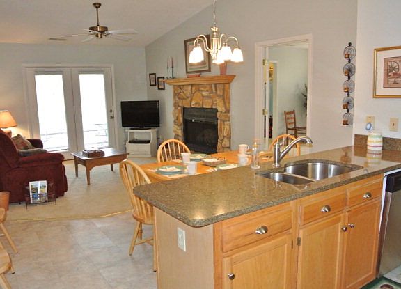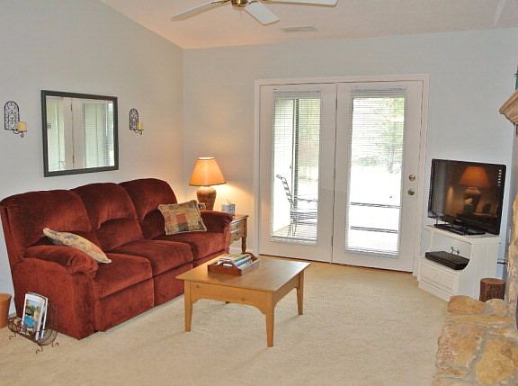 This amazing beautiful condo sits on the 4th tee box with gorgeous views all around. The inside is an open concept with vaulted ceilings and a stone gas log fireplace. The kitchen boasts plenty of cabinet and counter space with Silestone Quartz counter tops and nearly new stainless appliances. This extra large end unit has two master suites both with sitting/office areas and one with a jetted tub for relaxing after a day out and about - maybe golf, maybe shopping, maybe a hike through Mill Creek. There is a screened-in porch where you will enjoy the mountain views along with the well tended golf course even if you don't play golf!! New roof and new exterior paint two years ago. There is a storage area off the screened porch. This unit has what appears to be two front doors but the door to the far right is out of the master suite. The common area next to this unit is beautifully landscaped and even though it is considered common area it has the appearance of being a part of this unit and is handy for an outside sitting area.
