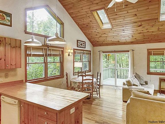 A must see home if you are looking for your private retreat in the woods, that is also in the heart of Woodstock. This beautifully built 2 bedroom 1 bath home is tucked away at the end of a long driveway, hidden in it's own woodland haven. The cathedral ceilings, numerous skylights and impressive windows keep your living room, dining area and kitchen awash in natural light. The sliding glass doors off the living room lead you to a large deck, overlooking your own wooded knoll, perfect for outdoor entertaining and summer barbecuing. The wood deck runs the length of the house and is also accessible to the master bedroom which is flanked by windows and sliding glass doors, the room is not only filled with light but invites the nature inside. There is a sweet second bedroom across the hall and the bathroom has a tub and a marble top vanity. This hidden country home is the best of both worlds, easy access to the center of town yet perfectly situated to remain quiet and secluded.