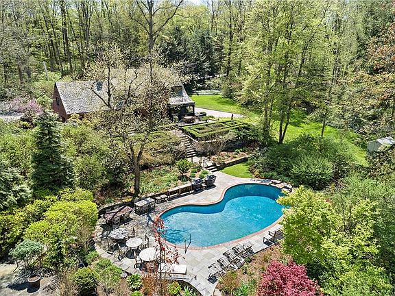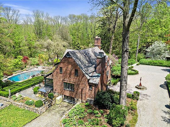 This stunning 1935 3 BR, 3.1 Bth tapestry brick Flemish cottage is sited on 3 park like acres. The lush landscape is a mix of lawn, colorful perennials, mature trees, and a brook fed pond. The home blends original details with state of the art updates. Additional features include a slate roof, 3 stone fiplcs, leaded glass windows, hardwood floors, wood beams, French doors and a gourmet kitchen. Exterior amenities consist of a 960 sq.ft 1 br, 1bth guest cottage, kidney shaped pool with waterfall, hot tub, and an expansive bluestone terrace. Whole house generator.