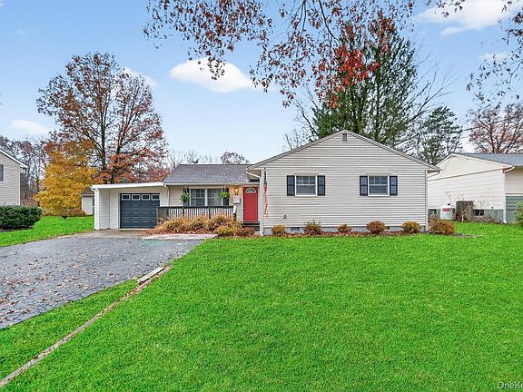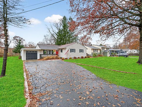 Enjoy single-level living in the Village of Washingtonville! The inviting front porch opens to a bright, spacious living room with hardwood floors, crown molding, and a sliding door to the back deck—perfect for barbecues or morning coffee while taking in views of the creek, trees, and flat backyard. The kitchen features black appliances and white cabinets with custom molding, while the roomy dining area is ideal for large gatherings or everyday meals. A hallway bathroom and linen closet sit near two bedrooms, and the primary suite offers a large closet and well-appointed full ensuite bathroom. Located in a quiet neighborhood within short distance to schools, shops, parks and public transit to NYC, this turn-key 3-bedroom, 2-bath home also includes a laundry room, carport and shed. Come make it YOURS!