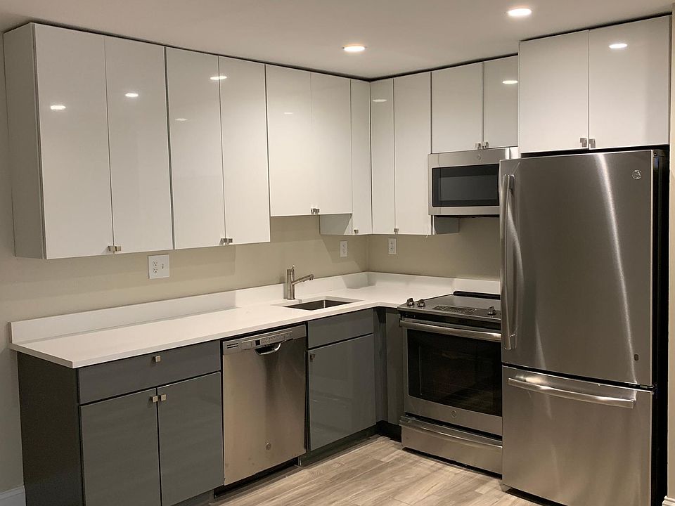 Newly renovated 2 bedroom condo duplex available for lease in Chelsea's waterfront neighborhood. This unit has been completely renovated. The 1st floor features wood floors throughout. Both bedrooms and the bathroom are located on the 1st level of the apartment. The bedrooms feature large closets, lots of light, and wood floors. The renovated bathroom features basket weave floor tiles, custom floating vanity/sink, huge shower with custom subway tiles. The renovated kitchen and living room are located on the bottom level of the unit and feature an open concept layout. The kitchen features custom two-tone cabinets, stone counter-tops, stainless steel appliances (dishwasher, stove, above the range microwave, refrigerator) and laundry hook-ups. Unit features a central air system. Shared back yard. Off street parking may be available for an additional fee.