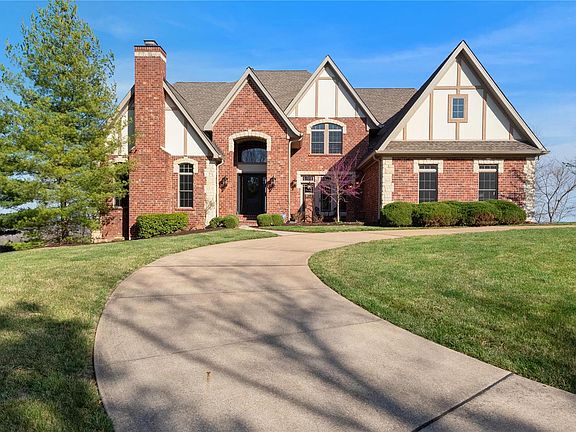 Nestled on a 3 acre estate, overlooking the Meramec River & 3 golf courses, this stately 1.5 sty home offers an incredible oasis! The resort style infinity pool w/spillover spa & separate hot tub allow you to enjoy the serene views while entertaining in style. Grand 2 sty foyer welcomes you, flanked by a den & dining room w/private patio. Beautifully appointed, the great room hosts soaring ceilings, custom built-ins & breathtaking views. The wet bar opens to the gourmet kitchen hosting top of the line appliances, custom hand painted cabinetry w/intricate moldings, granite counters, butler's pantry & adjacent hearth room w/stone fireplace. Offering a lavish retreat, the primary suite provides private access to the covered deck, dual walk-in closets & vanities, soaking tub & separate shower. A bonus room, 3 guest bedrooms, & 2 full baths grace the upstairs. The lower level is an entertainer's dream w/an extensive bar, stone archway leading to the wine room, guest suite & rec room! Additional Rooms: Wine Cellar