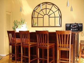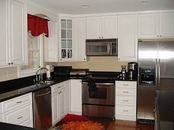 This updated, sundrenched home has many unexpected features and amenities. The kitchen has white kitchen cabinetry with black granite counter tops.