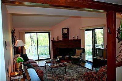 Enjoy carefree living at this fun contemporary home in Waters Edge featuring association tennis court. Panoramic views of three ponds from wraparound decks. Kitchen features maple cabinets, quartz countertops and glass tile inlay. Cathedral living room has a wood burning fireplace and two sets of sliders leading out to views and more views. Sliders off Master Bedroom so you can slip out to a cozy private area of the deck. Upstairs features two guest bedrooms, one with outdoor balcony, loft, and full bath. Central AC on the first floor, ceiling fans for guest bedrooms. Full basement with walkout sliders and detached garage are great for storing all your toys and gear. Need more space? The basement is ideally set up for future rumpus room, hobbies, etc. All just a short walk to spectacular swimming at Long Pond or Seymour Pond.