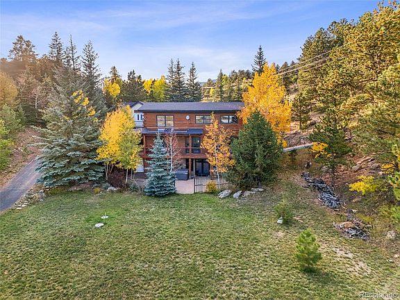 Acreage, Views, Flat Yard, Rock Outcroppings, a Barn, and an ADU, this home has it all! Discover this extraordinary mountain property just 5 minutes from Evergreen Parkway with nearly 8 acres of gently rolling land. The updated log home welcomes you with a great room showcasing a new high-efficiency wood-burning insert framed by a full stone hearth that reaches the ceiling. This inviting space flows into the dining area and kitchen, which is equipped with an island and a newer gas range. The rustic charm is enhanced by hewn timber wall panels, painted cabinets, modern lighting fixtures, and contemporary stone accents, creating a perfect blend of farmhouse aesthetics with modern conveniences. Stepping out onto the back deck you will find an a perfect view of the flat yard below, which opens up to both mountain views and city lights at night. Upstairs, the primary suite includes a 5-piece bathroom, en-suite closet and a spacious nursery, which could easily be transformed into a luxurious walk-in closet, customizing your personal sanctuary. The walkout lower level greets you with fresh paint, new carpet, and a versatile living area with a stylish bar, seamlessly connecting to a concrete back patio and a newer hot tub, which is included with the sale. This space is perfect for relaxation and entertaining, accompanied by two sizable bedrooms and an additional office or bonus room that could serve as a third bedroom. From the covered walk, find the 2-car garage with an ADU above. This versatile space, complete with its own bathroom and kitchenette, is perfect for a home office, in-law suite, guest quarters, or even rental opportunities. Don't miss the 1400 sq.ft. barn/workshop offering ample storage for vehicles (including RVs) and toys or transform it into an indoor pickleball court or craft your dream workshop! And for outdoor lovers—you’re adjacent to the Beaver Brook Watershed, a stunning expanse of National Forest with miles of scenic trails right out your door.