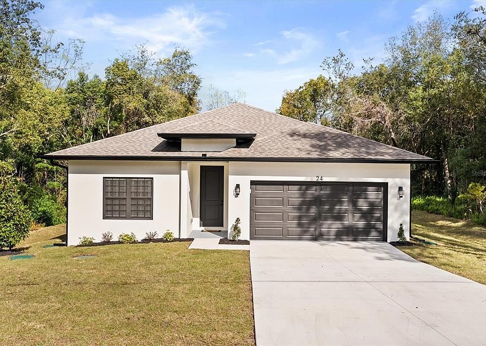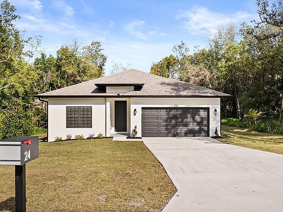 One or more photo(s) has been virtually staged. This is a MUST SEE brand new home in Debary. Just completed with LUXURY touches throughout, you won’t want to miss this one! Welcome to 24 Plantation Road, this three bedroom, two bathroom smart split floor plan home combines modern construction with durable, low-maintenance finishes. Wide plank luxury vinyl plank flooring runs through the home with no carpet. The kitchen features all-wood cabinets with doors and drawers, beautiful Quartz counters, stainless steel appliances, a deep stainless sink, and a large center island with seating for four. A walk-in pantry adds additional storage and everyday convenience. Recessed lighting and 8-foot doors enhance the open feel of the main living spaces. The primary suite includes extra bathroom storage and a spacious walk-in closet. An oversized indoor laundry room and coated garage floor support easy maintenance. Hurricane impact windows and an impact-rated garage door add peace of mind, while Cat 6 wiring and R38 insulation support modern connectivity and energy efficiency. Outside, the extended driveway provides additional parking. A covered rear porch overlooks the generous lot, complemented by 24-inch soffits, gutters, and a two-car garage. Enjoy low-cost living and NO HOA. Close to the Debary Sunrail Station, HCA Lake Monroe Hospital & the Central Florida Zoo, don’t miss your opportunity to see this beautifully and thoughtfully constructed home. Schedule a showing today!
