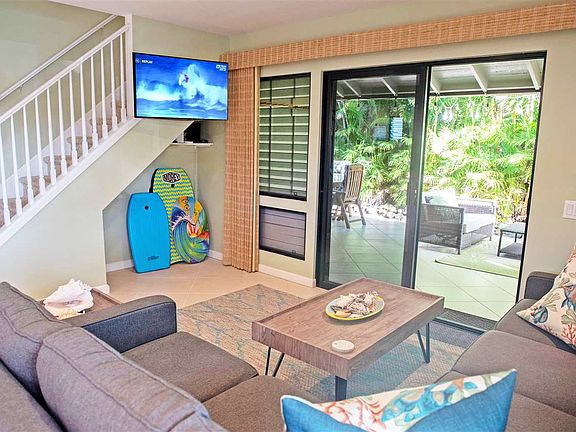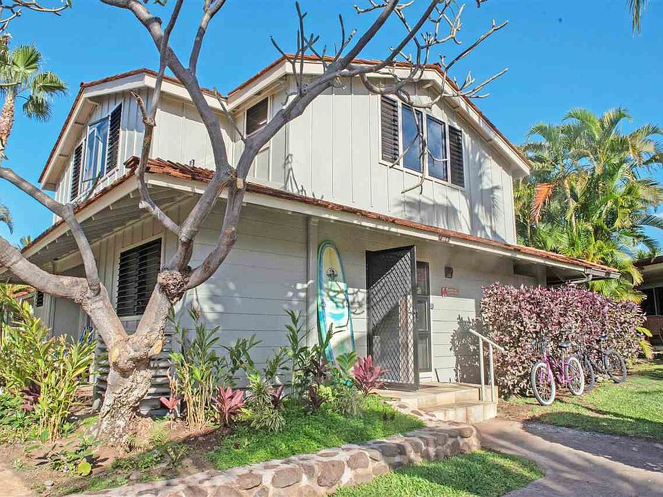 Welcome to your Puamana beach house: 24-4 Puamelia. Grab your board and in a few steps, you are at the beach. After a day in the ocean or the pool, enter the lanai area from your private side entry. Grill dinner on the gas BBQ and enjoy meals on the shady back lanai with your 'Ohana. You can check the ocean conditions first thing in the morning from your pillow in the main bedroom upstairs! Some may prefer to sleep downstairs in the spacious shady garden view bedroom with its own private bathroom and no steps. The third bedroom upstairs with two twin beds is perfect for guests or kids. Puamana is located on a seasonal sandy beach with three surf spots. Puamelia is a quiet street along the ocean in Puamana with no through traffic and no highway traffic noise. Continue along Puamelia place over the foot bridge to the historic Puamana clubhouse and the ocean pool. Stroll the 30 acres of oceanfront tropical gardens in Puamana, play tennis or work out in the ocean-view gym. Gather for sunset pupus or to talk story at the clubhouse. Puamana is a gated, low-density community with that classic Hawaiiana vibe, a popular vacation destination located within easy biking distance to historic Lahaina town. With the mild climate and clear waters, you will see why Hawaiian Royalty made Lahaina their home. Vacation rent your Puamana place when you are not on Maui; no special permits necessary. 24-4 is an end unit, remodeled in 2005 adding a 2nd floor. Several large lockable owner's closets are available for your toys. Check out the 3D tour.