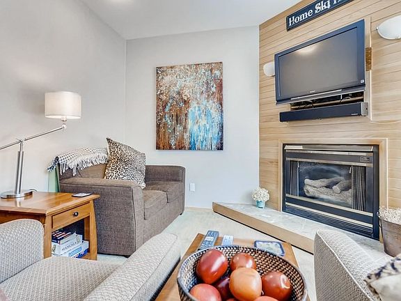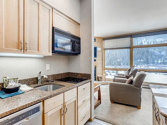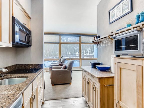 Great view of wetlands and ski area from this cute one-bedroom. Murphy bed in living room, so sleeps four comfortably. Big tub with window to living room was replaced with a second bath. As entrance is from the common area living room, that area with fireplace becomes essentially an extension of this condo, making it feel much bigger than it is. Very close to gondola for skiing and to the River Run area for festivals, restaurants and shops.