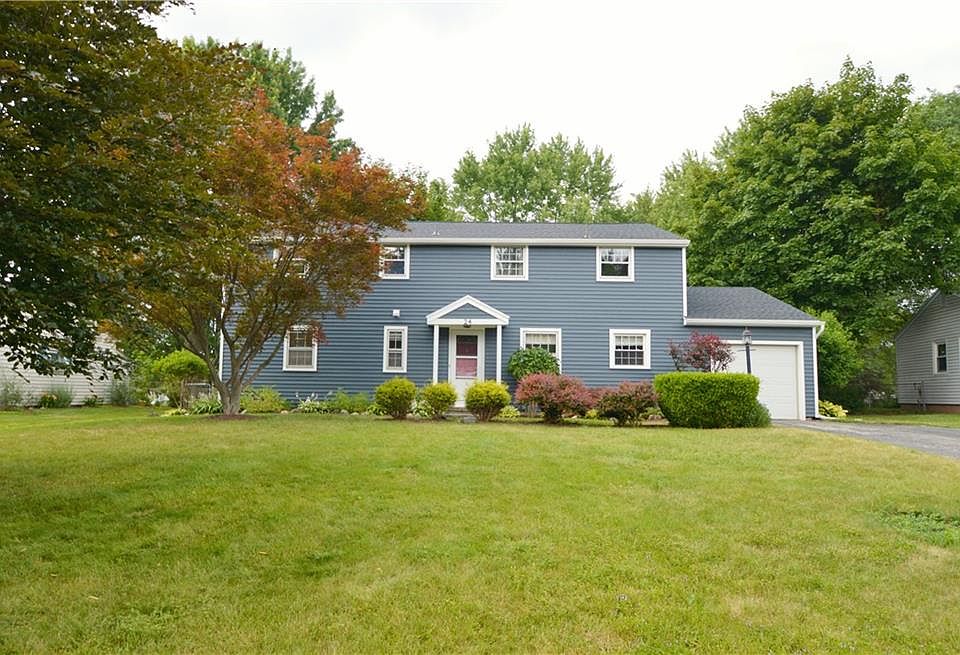 Fantastic Henrietta colonial in Indian Hills Subdivision! This 2,112 sq ft home features 5 bedrooms and 2 full baths. There's a great bedroom/office space and full bath on the first floor. Upstairs features 4 addition bedrooms with large primary bedroom. Newer HVAC and central air, one year old roof and newer siding. Outside the backyard is fully fenced and offers a deck and play area. Beyond the fence is town green space for extra room to enjoy.