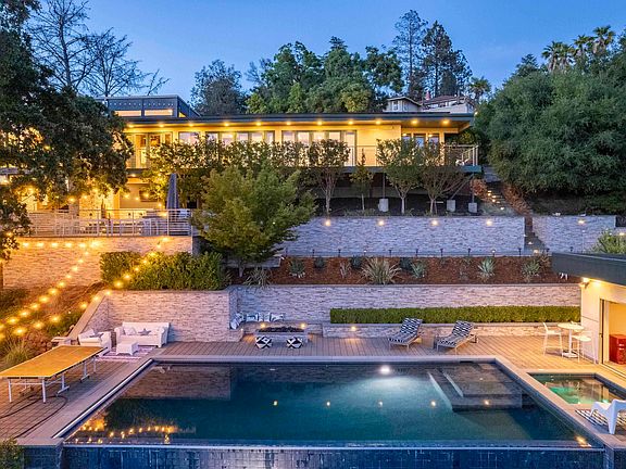 Gorgeous, gated, nearly 4000 square foot modern home built in 2006 - centrally located at the Lafayette / Walnut Creek border. Since original construction, a new luxury kitchen has been installed with floor to ceiling cabinets, high-end appliances including 48" WOLF gas range, sub-zero fridge, built-in espresso maker, and white quartz counters including a huge island. The primary bedroom is on the main level, with one other junior suite nearby. 2 more bedrooms are downstairs - each with their own bath - and just off of a large playroom/family room. Step outside to find an amazing view, a newer (2014) infinity-edge pool and spa, and pool house / cabana (approx 300 sq ft not included in square footage) and flat turf area near the entry. Don't miss the 3 car garage and additional parking on the driveway. A 15.4 KW owned solar array powers the house - installed 2016. Gracious, private, quiet, and convenient.