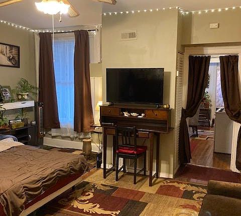 This is a truly unique apartment. It is a large studio apartment, The apartment has 150 year old hard wood floors a large closet, central A/C, as well as a washer and dryer. The kitchen is bright and airy. The bathroom has the original large claw foot tub and a shower. The building faces Patterson Park. It is on a great block in a wonderful neighborhood. If you go to school or work at Hopkins the shuttle is a half block away. You can also walk to Fells Point and Canton. The park has an indoor ice skating rink, tennis courts, fishing pond, free summer concerts, a new Olympic size swimming pool lot of ethnic festivals, etc. . . Also the Baltimore sports and social club has a lot of activities at the park. They organize teams for everything from kick ball, to flag football, as well as softball and volleyball. If you are not familiar with the area you may want to check out the Friends of Patterson Park and Baltimore Sports and Social club web sites. Call Michel Fish