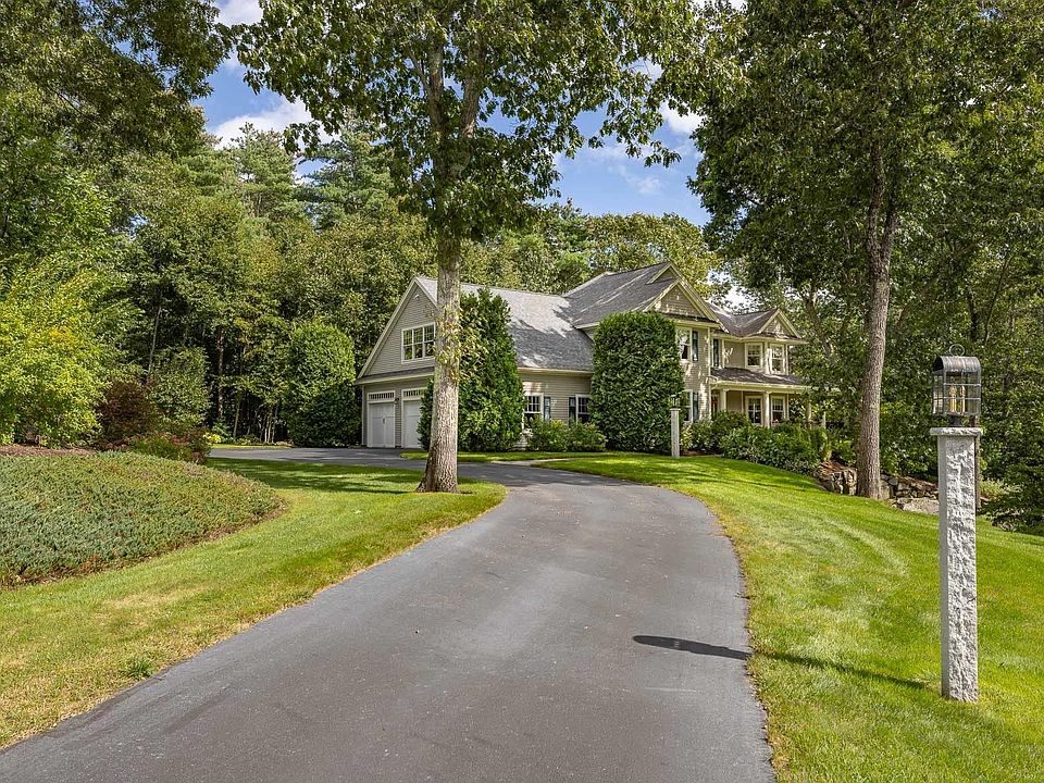 This remarkably well maintained home is nestled on a private 2-acre lot in Newfields "Evergreen Estates" Subdivision. With over 3264 above grade sq ft, this home's open concept & updated features make this colonial both functional & beautiful. First impressions start with a mahogany front porch which wraps around the front entrance. Interior features include an open concept kitchen, arched passages to living/dining room, gas fireplace and a well-proportioned study with French doors. Hardwood floors throughout, Multiple doors along the rear of the house allow access to large mahogany deck overlooking private, landscaped backyard. Immaculate kitchen features abundant storage with cherry cabinets, granite countertops, pantry, beverage fridge, wraparound 2 level island, and stainless steel appliances which opens to a large eat-in area & family room. 3 bay garage opens to a tiled mudroom featuring built-in bench & coat hook area for organization & storage. Separate laundry room and 1/2 bath complete the tiled service entryway. 2nd floor-amazing large primary suite with custom closet & walk-in tile shower, jacuzzi tub, vanity w/dual sinks, large linen closet for lots of storage. 3 additional bedrooms, 2 fully renovated baths and a spacious bonus room with large storage closet complete the 2nd floor. Additional features include whole house generator, radon mitigation system, and 13 zone irrigation system. Lower level sliding door & windows open to a patio.