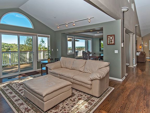 Tucked away at the end of a private lane you will find this custom home with approximately 2,800 square feet of living space on over a third acre homesite surrounded by majestic oak trees. Vaulted ceilings, arched transoms, clerestories, skylights, hardwood floors, dual pane windows and a palate of designer colors showcase stylish and light-filled living and entertaining spaces that seamlessly connect to a spacious Brazilian hardwood deck with inspirational Diablo Valley views. Elegant columns define the formal dining room. The entertaining space in the living room extends out onto deck through oversized sliding glass doors. The room features a vaulted ceiling and fireplace with marble surround. The kitchen is well-appointed with gleaming granite counter tops, mirrored backsplash, island and breakfast bar, custom glazed and cherry cabinetry with rollout shelves and a stainless double sink with garden window. Stainless appliances include a 5 burner Dacor cooktop, 2 Thermador ovens, dishwasher, GE Monogram refrigerator and a nearby wine bar with Vinotemp wine refrigerator. The family room also has a vaulted ceiling, surround sound, a wall of beautifully crafted built-in cabinetry and sliding glass door that opens onto the deck. The luxurious master bedroom retreat offers beautiful views, large walk-in closet and spa-inspired bathroom with dual sink vanity, decorative tile backsplash, jetted tub and shower with decorative tile detailing. The other 3 bedrooms offer a unique feature including vaulted ceiling, view, or nook for desk or sitting area. Call or Text Michael Moore (925) 289-8930 or Pete Sabine (925) 297-5335. Pacific Union Real Estate License #01271527