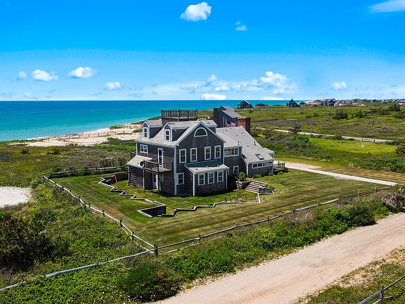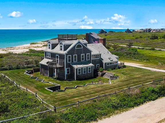 Discover the epitome of coastal living at 24 Sheep Pond Road. The open-concept great room seamlessly integrates the living, kitchen, and dining areas, highlighted by a cathedral ceiling and anchored by a magnificent floor-to-ceiling stone fireplace, offering warmth and a striking focal point. Large windows and glass sliders flood the space with natural light, offering unobstructed panoramic views of the Atlantic Ocean and a seamless indoor and outdoor living blend. The well-appointed kitchen features two dishwashers, two ovens, and ample counter space with seating. Whether enjoying a quiet evening by the fire or entertaining guests, the ocean views provide a stunning backdrop that never fails to impress. This thoughtfully designed home blends functionality in a private location, perfect for gatherings and relaxation—a serene retreat ideally suited for enjoying the surrounding vistas. Nestled across the street from hundreds of acres of Conservation and Land Bank land, this property offers unmatched privacy and a connection to nature. Experience the ultimate waterfront living in this beautifully designed home with abundant closets, ample storage, and custom built-ins. Just a stone's throw away from the Atlantic Ocean, embrace the coastal lifestyle and make this extraordinary beach house your own.