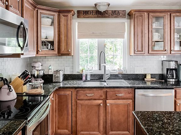 "Wachusett Woods" colonial. Come move right in to this open floor plan home with hardwoods throughout both main floor and upper level. Open concept first floor. Kitchen has a new island with granite and new upgraded lighting. Cabinet packed kitchen with stainless steel appliances. There is a slider off the dining room which leads to a composite deck over looking a wooded tree lined back yard. On hot summer days retract the awning and enjoy the deck.First floor laundry with a half bath. Head upstairs with an oversized main bedroom with a full bath. 2 additional bedrooms. The lower level has a finished room and a walkout to the backyard. The backyard offers a fire pit and patio for outdoor entertainment. A shed for additional storage . The landscaping is mature and the stone walls and walk ways add to this move in ready home.