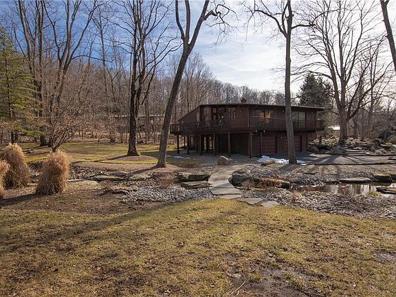 Stunning Wesley Hills Contemporary! This 4br/3ba home w/clear redwood siding & more than 2,800 SF is set on a corner property w/landscaped gardens & gentle stream. A soaring, 2-story architect-designed entry greets you. This grand entrance features a custom oak staircase. High-end interior finishes include oak parquet flooring, prized old growth Pecky Cypress paneling & French stone tiles. The open LR-DR area has vaulted ceilings, parquet flooring&sliders to the wrap-around deck w/views. The Chefs EI-Kitchen has solid cherry cabinets, granite, 2 DWs, 2 sinks, SS SubZero, Wolf wall oven, warming drawer & 6-burner w/pot filler. The master suite features sitting rm, generous custom closets & spa BA. There are 2 add'l bedrms & full BA on this level. Downstairs there's a family rm w/WB stone FP, bedrm, full BA, laundry, large storage closet & convenient 2-car garage access. Taxes are being grieved.