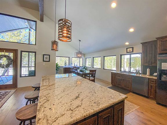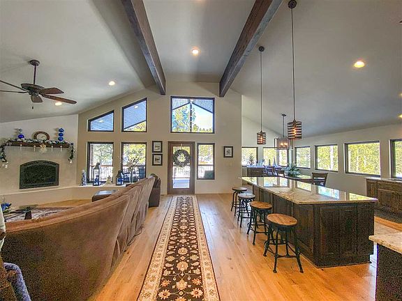 All your dreams in one in this stunning, three year old, modern mountain home. Situated on the fourth fairway of Angel Fire Resorts PGA rated golf course, nothing has been missed with this home. Enter through a large glass door with huge ceilings looking straight through the hallway, all the way onto the deck looking over the golf greens. Large vaulted ceilings and windows let in all the natural light and views for days, while remaining plenty private due to being raised from the golf course and nestled in trees. The ample main level living space has a gas fireplace, massive kitchen including bar area and butlers pantry. Do you dishes while looking at the top of Angel Fires mountain and the Chile Express. The open plan floor plan allows for a great size dining and entertainment space including the outdoor covered deck which you can enjoy all year round. Imagine yourself waking up to the deer and elk grazing, watching all the wildlife while drinking your morning coffee from this gorgeous outdoor space. On this main level you'll also find the master suite with a large custom bathroom and walk in closet. This room also has an additional closet which is used as an owners storage area - great for locking up personal belongings if you plan to rent it. On this level you'll also have access to the attached two car garage, powder room and laundry area. Head downstairs and the great living continues! There are two additional bedrooms, one being a master and the other being a jack and jill style bathroom to the secondary living area. Additional sleeping space in the nook area complete with 4 twin beds and again, ample storage. Walk out level to a lovely fire pit area, inviting hot tub and just steps away from the golf greens, or if Nordic skiing is more your style, then you can do so right from the backyard! This wonderful, modern and newer home is low maintenance and not to be missed! Walking distance to Olympic Park for lots of family fun and just a short drive to the ski area. Property comes furnished, with a small exclusion list and it is currently set up to sleep 10 people, although can accommodate more if desired.