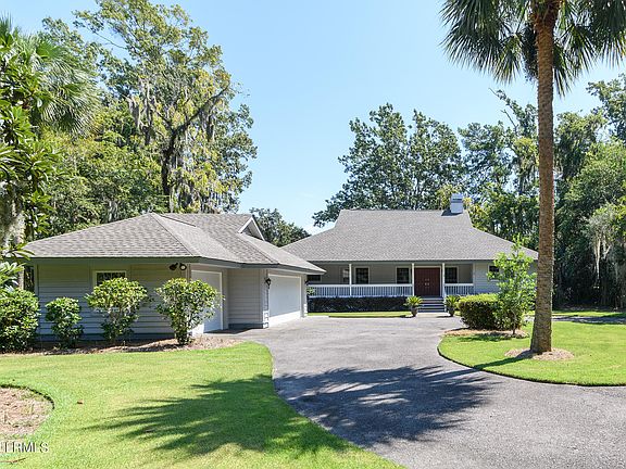 This comfortably sized home is a perfect fit for entry pricing . Open floor plan, high ceilings, skylights, hardwood floors, raised brick fireplace, built-in bookshelves and more. Split floor plan separating the Master bedroom from guest bedrooms offers privacy. Enjoy outdoor living in your oversized screened porch, complete with sky lights. This beautiful setting has scenic views of ponds and long views of golf over two holes on the Tom Fazio designed Palmetto Course Holes #5 & #7. New Landscaping, Roof 2019, 2017 HVAC, 2019 garage doors. Driving over our causeway entrance you will leave your hectic life behind and enjoy the natural beauty!