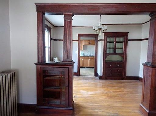 Traditional style 2 family, hardwood floors, Lovely natural wood columns, bookcases between dining rm and living rm. Natural woodwork, Eat in kitchen, oak cabinets, mod bath. 1st & 2nd floor essentially alike except 2nd fl has claw foot tub. A little effort will bring this home back to its former elegance. Showings begin November 3rd.