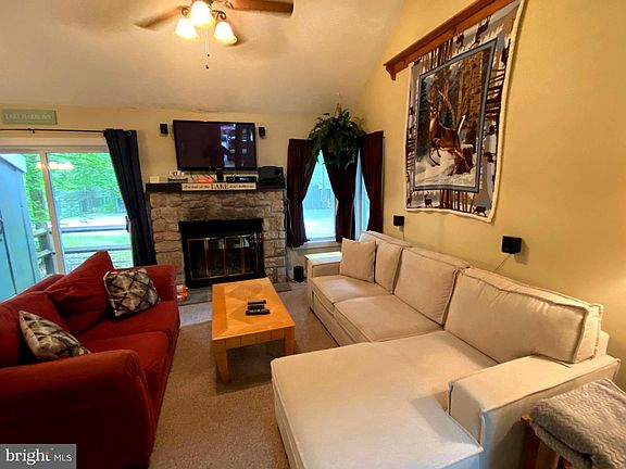 Location , Location , Location ! This well maintained slope side chalet is located in desirable Snow ridge Village at Jack Frost Mountain. Close to everything Lake Harmony Has to offer. This end unit has covered front porch entrance to foyer. 1st floor has large living room , dining room combo with soaring vaulted ceilings and stone fireplace. The dining area has sliding doors to rear deck for outdoor entertaining. The island kitchen has newer appliances, including refrigerator, range , built in microwave and dishwasher. The 1st floor also has a large main bedroom with private access to the hall bath with ceramic tile counter and tub/shower surround and vinyl plank floors. The 2nd floor has a large loft sleeping area and 1/2 bath. This home away from home comes fully furnished with 3 flat screen tv's, newer sectional and dining room furniture. Great rental history as property sleeps 6/7 comfortably with queen bed in first floor bedroom and 2 twins in the loft plus pull out couch. A great investment or 2nd home.