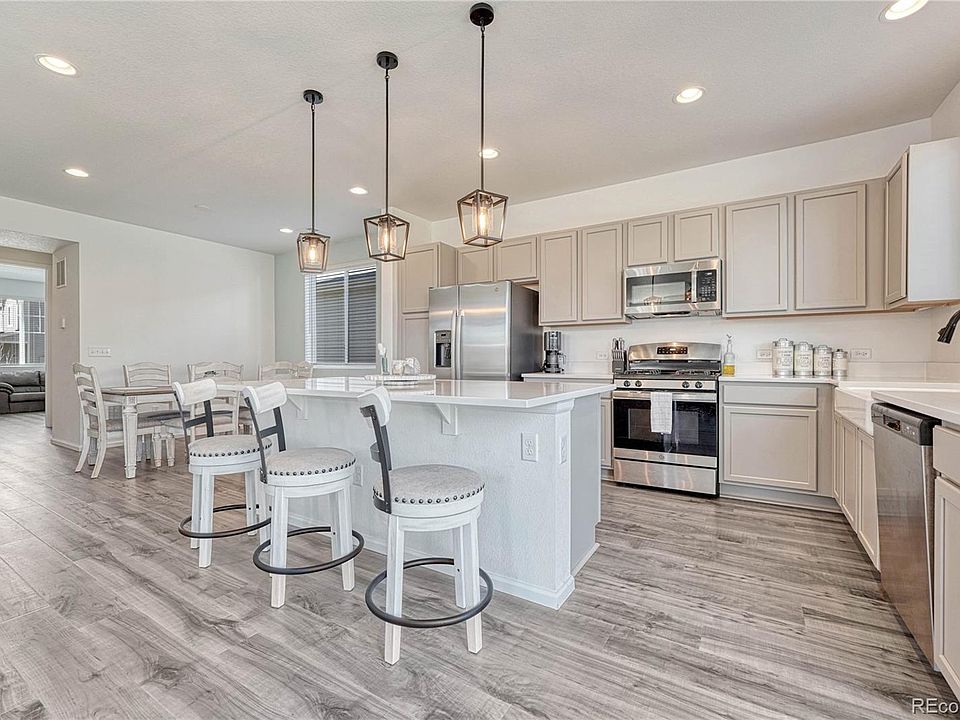 - Description: Stainless Steel Appliances, Large Island With Pendant Lighting, Quartz Countertops, Farmhouse Sink