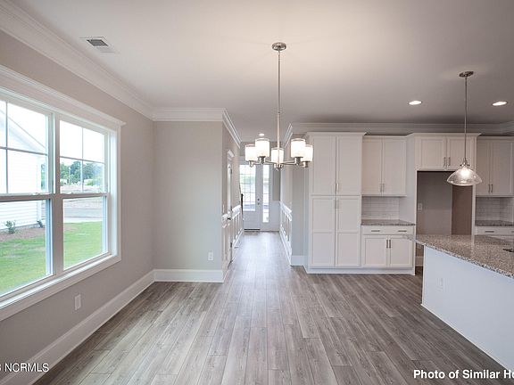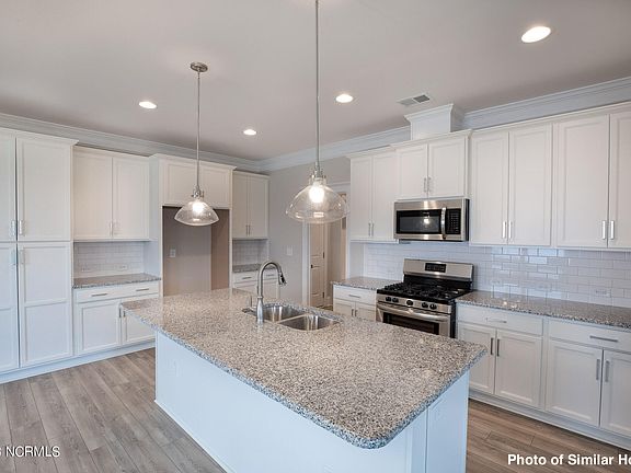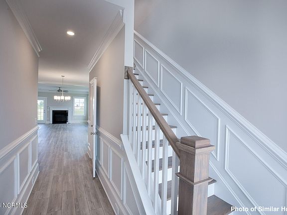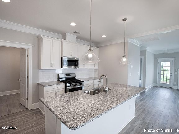 Currently under construction is the Fontana from Caviness & Cates. This home offers an open living area, kitchen and dining area flowing seamlessly together for the perfect space to entertain. The gourmet kitchen boasts timeless white cabinets, large center island, ''Carrara Retro'' quartz countertops, ''daphane white'' herringbone backsplash, and stainless-steel appliances, including a dishwasher, natural gas cooktop, range hood, wall oven and built-in microwave. The great room offers a cozy gas fireplace and leads to your covered rear porch with grill patio. The first-floor primary suite is tucked away on the back of the home and includes a trey ceiling, spacious walk-in closet with wood shelving, double vanities, 6-foot, tiled zero entry, walk-in shower with bench and frameless shower door, private water closet and linen closet. Completing the first floor is a mud room/laundry room with built in drop zone and half bathroom. The second floor includes 3 additional bedrooms each with their own walk-in closet, full bathroom with double vanity, large loft and sitting area. Be sure not to miss the additional garage space with the added golf cart garage for your personal low speed vehicle or just additional storage. Additional features include crown molding and Luxury Vinyl Plank flooring throughout the first floor living areas, wainscoting in the foyer, oak tread stairs, epoxy garage floor, natural gas tankless water heater and gas HVAC. The Sanctuary at Forest Sound is centrally located in the heart of Hampstead. 15 minutes to Wilmington or Surf City/Topsail and just 1 mile off the Intracoastal Waterway. Future proposed amenity includes a boat storage area. All options, finishes and completion dates are subject to change. See agent for details on selections. Photos and video shown are of a completed home; selections will be different.