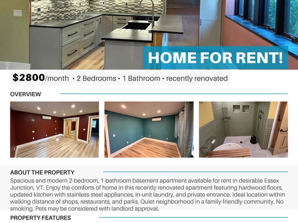 Spacious and modern 2-bedroom, 1-bathroom basement apartment available for rent in desirable location in Essex Junction, VT. Enjoy the comforts of home in this recently renovated apartment featuring hardwood floors, updated kitchen with stainless steel appliances, in-unit laundry, and private entrance. Ideal location within walking distance to shops, restaurants and parks. Quiet neighborhood in a family-friendly community. No smoking. Pets may be considered upon landlord's approval.