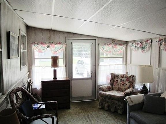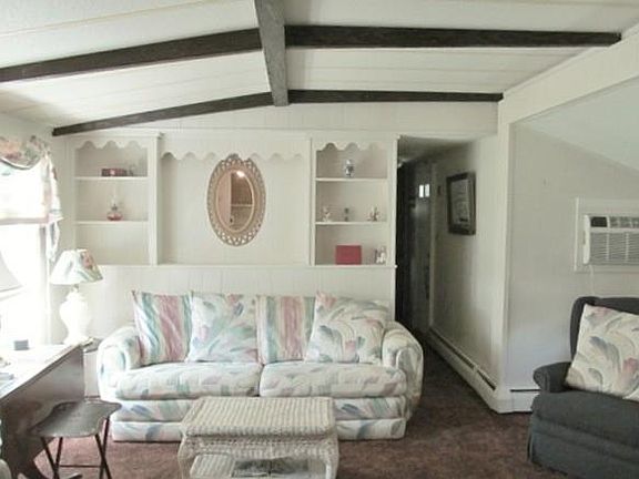 CHARMING & SPECIAL !! UNIQUE floor plan. There has been several updates to this property ie: new roof, new insulation, new carpeting, newer windows & new remote-control A/C wall unit. This home located in a " cul-de-sac" area with fenced back yard , has an "awesome" open floor plan including modern kitchen layout. You have privacy re: bedrooms located @ opposite ends of this home, spacious bath has roomy counter-top, linen closet, under-sink cabinetry & laundry area. Lg. windows create a bright & sunny living area & the wide bumpout adds lots of roominess to" spread out" when entertaining. There is a spacious, carpeted porch with wrap-a-round windows that gives you even more area to relax & enjoy in a bright yet private setting. This retirement community features an inground pool & cabana area and a clubhouse that offers lots of fun activities + provides a separate area for residents to store their recreation vehicles, ie: campers, etc. This is a real got-to-see home !!