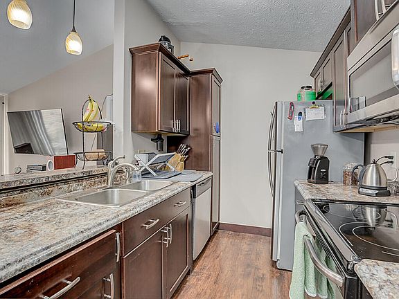 - Features: Laminate Flooring, Galley Kitchen, Wood Cabinets, Solid Surface Counters