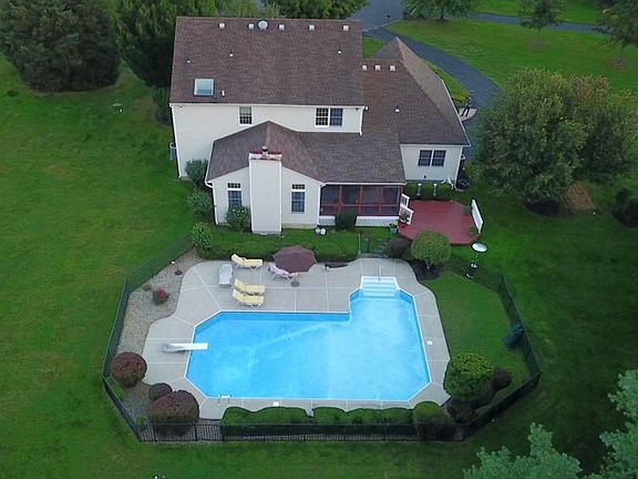 Quintessential Center Hall Colonial is located at the end of a cul-de-sac in Falcons Ridge! Sited on a level lot that backs to woods conservation land for privacy, this 5 Bedroom, 3.5 Bath home offers a newer roof, newer 7 zone HWBB heating system, newer driveway newer septic system. Maintained updated home features a double story Foyer that leads to the Living Rm w/French Doors for access to the Office/Playrm the large Kitchen that is open to a grand Family Rm. The main floor 5th Bdrm is adjacent to a full Bath. In addition to the Master Bdrm Bath, the upper level offers 3 additional Bdrms shared Bath. The walk-up basement features a 1/2 bath, exercise room wet bar. The large backyard offers a heated in-ground pool a screened in porch to enjoy the peaceful surroundings!
