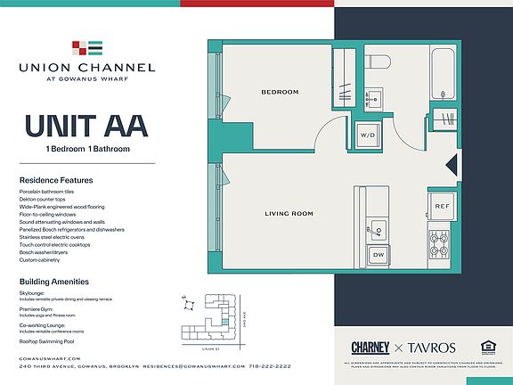 Union Channel marks the debut of Gowanus Wharf's campus of residential buildings in the heart of Gowanus, Brooklyn. Situated on the corner of Union Street and 3rd Ave, Union Channel is a collection of 224 apartments, easily identifiable by its undulating facade and metal paneled angular-shaped bay windows, and one block from the R train and just 3 stops into Manhattan. *Residences* Designed by Fogarty Finger architects, the uniquely crafted residences promote balance in pursuit of the living ideal. Inspired by a neighborhood flowing with artists, creatives, and culture, Union Channel is an ode to the enduring spirit of Brooklyn and no detail has been overlooked. From work-from-home to hosting friends, every apartment is built with intention. Apartment features include open and airy layouts, island kitchens, panelized appliances, industrial countertops, wide-plank flooring, floor-to-ceiling windows, European-like balconies, and ample closet space. *Amenities* The Drift Club at Union Channel is for those seeking a balanced lifestyle and exclusive access that extends outside the walls of the building. Featured amenities include: 24/hr Doorman + Concierge Premier Fitness Center + Yoga Room with regular classes and programming Work From Home Lounge Skylounge with Private Dining and Viewing Terrace Rooftop Pool with Skyline Views Landscaped Roof with Bocce, Cornhole, Bar, and BBQs Our connection to the community is equally important. We've created a custom Gowanus Wharf App designed to bring what matters most to your fingertips. On the app, access your complimentary Brooklyn Museum membership, join interest-based community groups, create and attend local events, reserve amenities, open your apartment, sign up for fitness classes, meet your dog concierge, and much more. In a city where change is the constant and the constant moves at hyperspeed, development doesn't need to be a dirty word. Our mission is to activate a residential and retail experience that is an authentic expression of our locale. That catalyzes community, culture, and sets a new standard for city living. Gowanus Wharf is designed to achieve the perfect balance of art and commerce, nature and digital integration, and legacy and transformation. A tribute to the enduring spirit of Brooklyn, The Wharf is a stage built for residents, retailers, and visitors to pursue their living ideal. From a place of balance, the most important things in life come into focus. Upfront fees: Application fee: $20 per application Security deposit: $1,000 for qualified applicants Amenities: $100pp + $500 annual pool fee (ask about any specials!) Storage fee: $100 (optional) Bike storage fee: $25 (optional) Risk Protection fee: $20 Parking (optional): $400 (optional) Residents are responsible for electricity payments based on usage
