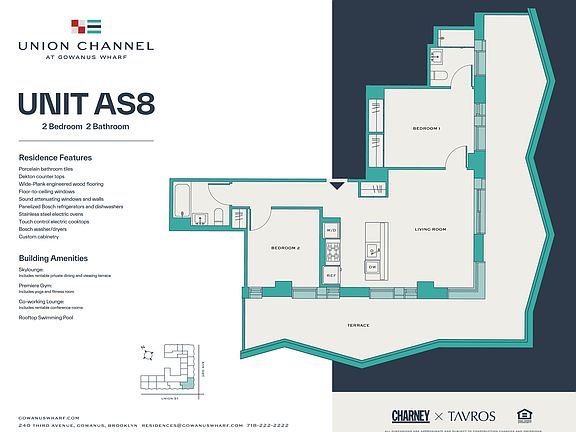 *Massive Wrap Around Terrace with Unobstructed Views. One of the nicest apartment at Union Channel.* Union Channel marks the debut of Gowanus Wharf's campus of residential buildings in the heart of Gowanus, Brooklyn. Situated on the corner of Union Street and 3rd Ave, Union Channel is a collection of 224 apartments, easily identifiable by its undulating facade and metal paneled angular-shaped bay windows, and one block from the R train and just 3 stops into Manhattan. *Residences* Designed by Fogarty Finger architects, the uniquely crafted residences promote balance in pursuit of the living ideal. Inspired by a neighborhood flowing with artists, creatives, and culture, Union Channel is an ode to the enduring spirit of Brooklyn and no detail has been overlooked. From work-from-home to hosting friends, every apartment is built with intention. Apartment features include open and airy layouts, island kitchens, panelized appliances, industrial countertops, wide-plank flooring, floor-to-ceiling windows, European-like balconies, and ample closet space. *Amenities* The Drift Club at Union Channel is for those seeking a balanced lifestyle and exclusive access that extends outside the walls of the building. Featured amenities include: 24/hr Doorman + Concierge Premier Fitness Center + Yoga Room with regular classes and programming Work From Home Lounge Skylounge with Private Dining and Viewing Terrace Rooftop Pool with Skyline Views Landscaped Roof with Bocce, Cornhole, Bar, and BBQs Our connection to the community is equally important. We've created a custom Gowanus Wharf App designed to bring what matters most to your fingertips. On the app, access your complimentary Brooklyn Museum membership, join interest-based community groups, create and attend local events, reserve amenities, open your apartment, sign up for fitness classes, meet your dog concierge, and much more. In a city where change is the constant and the constant moves at hyperspeed, development doesn't need to be a dirty word. Our mission is to activate a residential and retail experience that is an authentic expression of our locale. That catalyzes community, culture, and sets a new standard for city living. Gowanus Wharf is designed to achieve the perfect balance of art and commerce, nature and digital integration, and legacy and transformation. A tribute to the enduring spirit of Brooklyn, The Wharf is a stage built for residents, retailers, and visitors to pursue their living ideal. From a place of balance, the most important things in life come into focus.