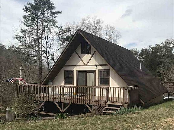 A must-see 3 bedroom 2 bath A-frame with full finished lower level walk-out basement situated on 1.6 rolling acres, featuring a circular gravel driveway, beautiful mature trees, and a stream running through property. Property is surrounded by additional wooded acreage, giving the feeling of being in your own private retreat, yet only minutes from I-81 and Morristown, just two miles from Nolichucky Vineyard on Fish Hatchery Rd. Lower level features a covered deck, family room with wood stove, extra kitchen for guests or entertaining (or mother-in-law suite), laundry room, bathroom, bedroom and an office (office could be a 4th bedroom or man cave). Main level features a large vaulted open great room with french doors going out to another deck, free-standing gas fireplace, kitchen/dining area, bedroom, and full bathroom, with another door at the far end of this level going out to the 3rd deck (which sits above the lower deck with steps going down to the lower level from this deck. Top level features a loft bedroom open to the great room. Lots of closets and storage, including 10x12 shed. Home is on public water, but also offers a private well. Natural gas is available. If you're searching for that one of a kind, serene property that offers privacy and relaxation, yet is still convenient to town, look no further....you have found your home! Won't last....call today to schedule a showing.