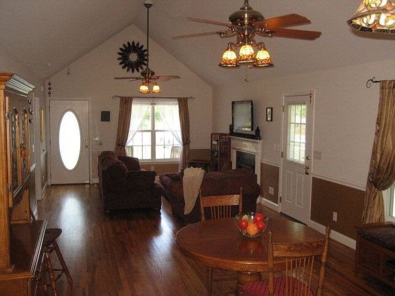 Darling cottage w/ covered front porch, open floor with split bedrooms. Beautiful wood flooring in greatroom & kitchen. Kitchen appliances remain. Master BR boasts large WICt, spacious Bt w/dual vanity. Home was planned with Universal Design in mind, complete with inconspicuous ramp at side door and step-in shower with seat. Fenced patio opens to larger yard with outbuilding, mature trees.
