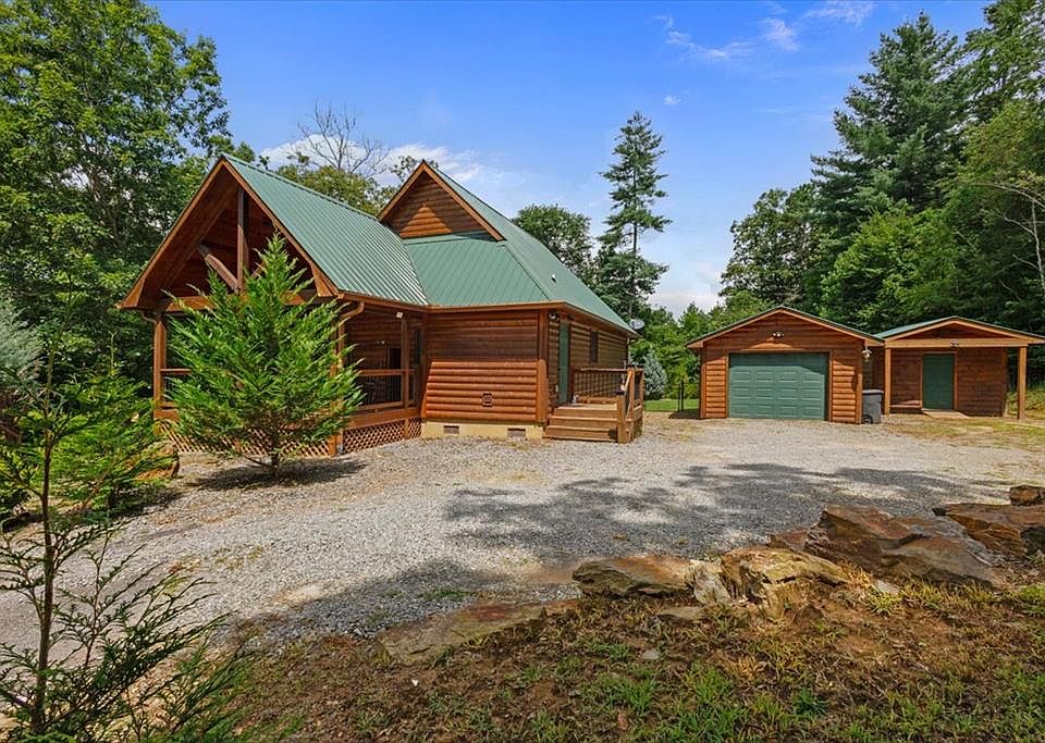 Escape to this beautifully crafted 2 bedroom, 2 bath log sided cabin, offering the perfect blend of rustic charm and modern convenience. Nestled in a peaceful setting, this home welcomes you with a massive covered front porch- ideal for relaxing with your morning coffee, or entertaining guests year-round. Inside you'll find a warm and inviting living room centered around a stunning stacked stone gas log fireplace- perfect for cozy evenings. The custom kitchen is a true standout, featuring rich wood countertops, handcrafted cabinetry, and thoughtful details throughout, making it as functional as it is beautiful. Both bedrooms are generously sized, and each bathroom is designed for comfort and convenience. The fenced yard offers a safe space for pets to roam, while the detached 1-car garage and separate storage shed provide ample space for tools, toys, and outdoor gear. Whether you're looking for a full-time home, weekend retreat, or investment property, this cabin checks all the boxes for mountain living with style and comfort- and all of this sits on over an acre! Fiber Optic internet is available at the property.