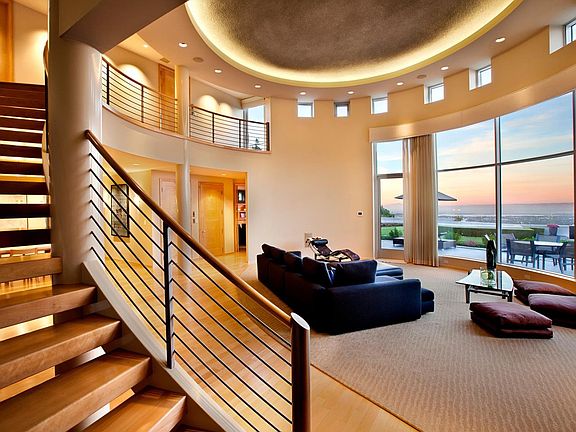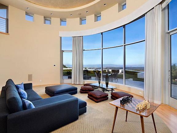 Sweeping views of San Francisco Bay. Modern high-tech home on 3+ acres in Woodside, central to Sand Hill Road, Stanford University, and San Francisco International Airport, and home to many of Silicon Valley's leaders. 2-story living room with walls of glass orientated toward the view, Elevator. 12 foot ceilings in basement with tremendous unfinished commercial grade space ideal for creators and collectors. 2 multi room apartments, 21 kw solar system, infinity pool, putting green, firepit, terraces.