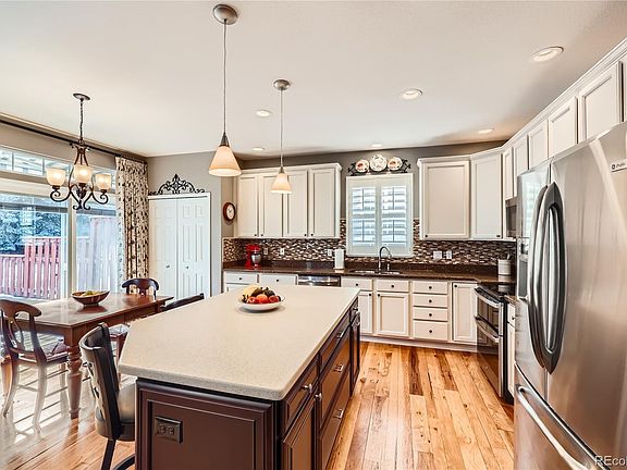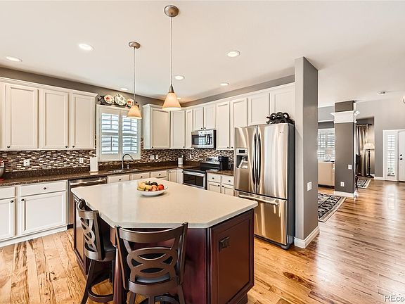 Step into this beautifully updated home and fall in love with one of Castle Pines' most sought-after floor plans! From the moment you enter, the stunning wide-plank wood floors and soaring ceilings create an inviting and elegant atmosphere. These gorgeous wood floors extend throughout the main level, complemented by plantation shutters that add a timeless touch. The open-concept design seamlessly connects the kitchen and great room—perfect for modern living. The stylish kitchen features solid-surface countertops, stainless steel appliances, and a spacious island. For more formal gatherings, enjoy the separate living and dining rooms, bathed in natural light from the home's numerous windows. The private home office is set apart from the main living areas for ultimate focus and productivity. Upstairs, the luxurious master suite features a coffered ceiling and an elegantly remodeled ensuite bath with an oversized shower, stunning granite, designer tile and heated floor. 3 additional bedrooms share a beautifully updated guest bath with modern cabinetry, granite, and tile. The 2nd floor laundry adds everyday convenience—no more hauling laundry up and down the stairs! Outside, the spacious backyard is perfect for entertaining. Host summer dinners on the expansive Trex deck, complete with plenty of room for outdoor furniture, and relax under the retractable awning that provides shade from the Colorado sun. A charming side-yard sitting area offers another peaceful spot to enjoy the fresh air. The finished basement offers incredible versatility, complete with a full bath, a bedroom area, and a spacious living area. With the roof, gutters, furnace and A/C replaced in 2019, you have peace of mind the major systems of the house are newer! Enjoy fantastic community amenities, including a six-lane, 25-meter pool, tennis courts, and a basketball court—all just steps away. Plus, a one-year home warranty is included for peace of mind!