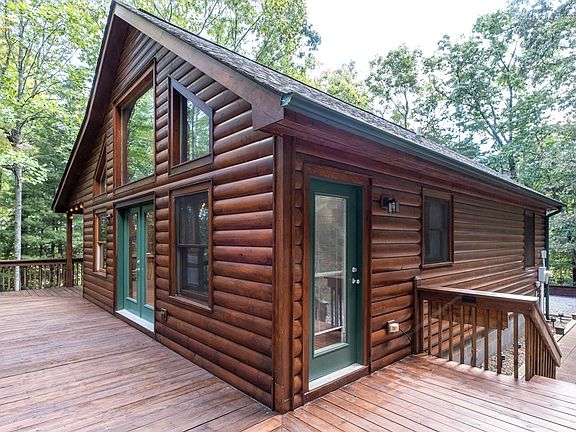Tucked away on nearly 2 wooded acres, this partially furnished 2 bedroom, 2 bathroom log-sided cabin offers privacy, character, and quality craftsmanship throughout. A long gravel driveway winds through the trees and opens to a spacious flat parking area with plenty of room for multiple vehicles. From the moment you arrive, the rustic charm is undeniable. Steps lead up to the front deck, which wraps around the home and connects to a custom-built party porch with an outdoor bar area and a cute wagon wheel light fixture. Continue around the back to find a second screened porch with built-in bench seating, giving you two incredible outdoor living spaces that surround three sides of the cabin. Inside, the Great Room welcomes you with soaring vaulted tongue-and-groove ceilings, chalet windows, and rich hickory floors that run throughout the home. A cozy stone fireplace anchors the space, while the open kitchen impresses with stainless steel appliances, granite counters, tile backsplash, an island, and abundant cabinetry. Glass doors connect the living and kitchen areas to all three porches, seamlessly blending indoor and outdoor living. Down the hall, you'll find a convenient laundry area with washer and dryer included, a full guest bath, a guest bedroom with walk-in closet, and the Master Suite with its own ensuite bath. Recent updates include a new water heater in 2025, plus the convenience of Fiber Optic internet. Perfectly located just minutes from downtown Murphy, close to whitewater rafting in Tennessee, and only about two hours from Atlanta, Knoxville, and Chattanooga, this cabin combines seclusion, comfort, and accessibility. Whether you're seeking a mountain getaway or full-time home, this cabin offers it all.