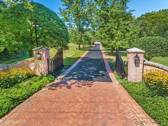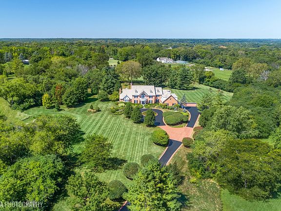 Situated on a sprawling 5-acre estate in the heart of prestigious Barrington Hills, Illinois, this noteworthy home epitomizes the country lifestyle; a perpetual illustration of luxury and serenity entwined. An iron gated entry invites you through a sweeping tree lined drive as you arrive upon the residence. Surrounded by lush, meticulously landscaped grounds, this significant home offers both privacy and picturesque views of the stunning estate featuring a spring fed pond. As you approach the circle drive with a brick paver ribbon, you are met with a beautiful blue stone path and impressive covered entry leading to the front door. A bright, two story foyer greets you with its show stopping bridal staircase in this beautiful marble entryway. The gallery summons as you step through to find inside the home its grand living spaces with soaring ceilings, floor-to-ceiling windows, custom trim and moldings, and high-end finishes throughout. The gourmet kitchen is a chef's delight, complete with state-of-the-art stainless steel appliances, custom in-set 42" cabinetry, oversized center island with a prep sink perfect for culinary creations and entertaining. This large kitchen also offers a breakfast bar, a sizable eating area, workspace, a rear staircase and also adjoins seamlessly to the charming four seasons room. The opulent master suite serves as a private sanctuary, featuring two lavish en-suite full bathrooms, 2 large custom built walk-in closets, a marble fireplace, and walk-out balcony with sweeping views of the expansive bluestone patio's English gardens and grounds. Also on the 2nd floor are three secondary bedrooms & two full baths plus a large joined flex space which offers ample sleeping arrangements and/or optional studio or workspace. Additional highlights include a substantial formal dining room with a stunning custom butler's pantry connecting to the kitchen, a grand living room with a beautiful fireplace, as well as an exquisite wood paneled library with floor to ceiling built-ins, stained glass transom windows, fireplace with verde marble surround, stately gold leafed ceiling and French doors offering direct exterior access to the heated bluestone patio. The lower level of this home has been beautifully finished with a family/media room, custom wet bar, brick fireplace, 5th bedroom with a walk-in closet and direct access to the full bath. The basement also hosts a gorgeous billiards room, and, for the wine enthusiast, a temperature controlled walk in wine cellar complete with a built in humidor, choice for the cigar aficionado! Outside, an oasis awaits as you step out onto the expansive iron-gated and heated blue stone patio featuring a full outdoor kitchen, large pergola, English gardens, and a built-in stone fire table. The pristine lawn provides a perfect setting for outdoor activities and gatherings. The property offers plenty of space for a future pool/pool house if you so desire. Built in 1995 this brick estate home has been extensively upgraded and impeccably maintained. The oversized three-car heated garage has freshly installed epoxy flooring, built-in custom cabinetry, built-in workbench area, exterior access to side yard, and direct staircase to lower level. Two generators, zoned HVAC, boiler offers radiant heated flooring in the lower level, bluestone patio & four seasons room, newer 100-gallon water heater, upgraded newer water treatment & filtration system, upgraded electric panels, security system, outdoor lighting and exterior water irrigation line spigots at multiple locations. Enjoy the opportunity to also own an adjacent five acres lot with a gated English garden, also available for purchase and located at 11 Barrington Hills Road. Hobby farms and horses allowed. This Barrington Hills estate is located just 35 miles Northwest of the City of Chicago.
