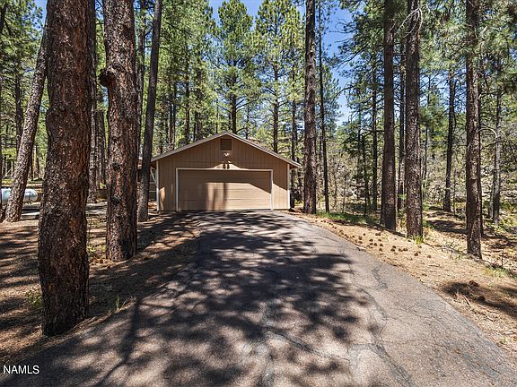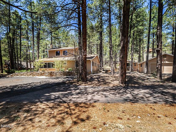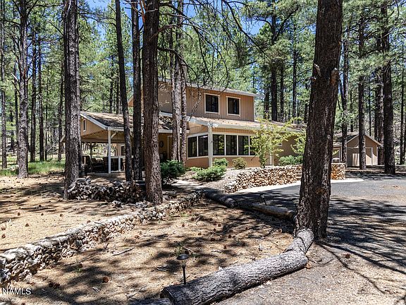 What you've been looking for!!!! Almost an acre of land within Pinewood Subdivision including a detached guest house and a detached garage. Plenty of room to roam in the extra large yard, including a seasonal stream bed on the east side of the lot. The home has a large entry/setting room, living room with a real rock fireplace, sliding door to a covered patio. Two bedrooms on the main level, including one and a 1/2 baths. Upstairs was added in approx 1986 that includes a bunk room, bath and a large closet