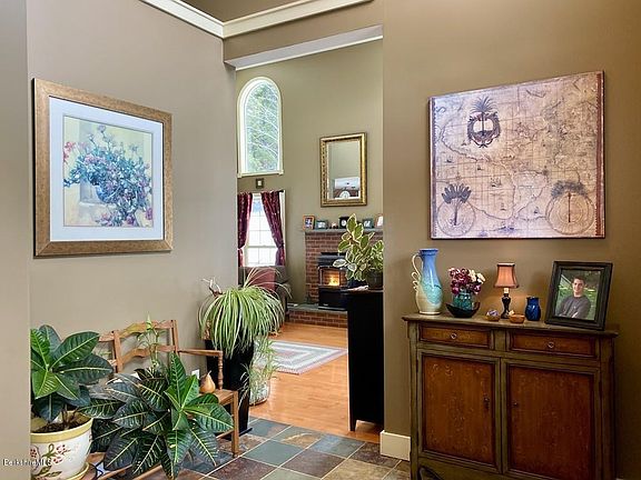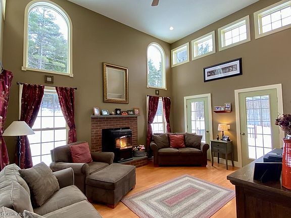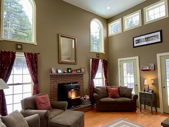 - Description: Fireplace, stove, cathedral ceiling, wood floor