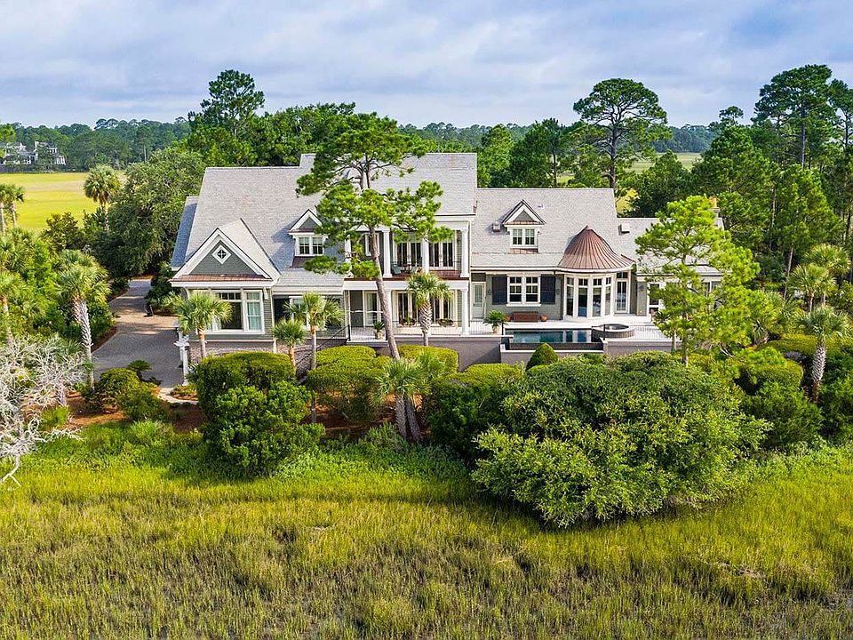 240 Eagle Point Road is spectacularly sited in total privacy on a narrow peninsula of land extending out into Kiawah's picturesque Cinder Creek. Designed by acclaimed architect Wayne Windham to take advantage of the vast views, this home enjoys a joint deep-water dock, two tiers of outdoor living spaces, and an in-deck infinity pool with spa. Outside, this cedar-shake, slate-roofed coastal home is gorgeous with details like carriage garage doors, a brick-lined ground level, and curving brick stairs with a wrought iron railing leading to a covered front porch. Inside, the home is appointed with impeccable trim, wide crown molding, high ceilings, walnut flooring, and transomed doors and windows. A foyer with barrel-vaulted ceiling welcomes friends to step inside. Straight ahead is the spacious living room featuring a gas fireplace with stone surround. Floor-to-ceiling glass doors open to the rear covered porch, showcasing the stunning views in two directions. Open to the living room, the dining room is exceptionally designed with a rounded window wall, and an arched doorway leads to the butler's pantry with its Viking® wine cooler, prep sink, and rich wood cabinetry. The spacious kitchen delights with large windows over the farmhouse sink, granite countertops, and a large center island with breakfast bar and prep sink. The top-tier appliances include a Bosch® dishwasher, Wolf® cooktop and dual oven with custom copper hood, double wall ovens, and microwave, while the Sub-Zero® refrigerators are paneled to match the cabinetry. The kitchen opens to a family room and a circular breakfast room that features a turreted ceiling and transomed windows showcasing the 180-degree views of the tranquil marsh. The family room leads out to an expansive, two-story screened porch with a wood-beamed, vaulted ceiling, summer kitchen, and stone-surround fireplace. Highlights of the spacious library include exquisite built-in shelving, media center, and coffered ceiling. The master suite is also located on the main level. Sunny and bright, a wall of transomed windows embrace gorgeous views in two directions. The dual master baths offer luxury and privacy. The master bath for her features marble flooring, a standalone soaking tub, and a walk-in shower. The master bath for him is handsomely appointed with a vanity of rich wood. A curving staircase leads to the second floor where a central hall opens to the media room and sitting area. Here, glass doors overlook the waters of Cinder Creek and open to a second-story covered balcony. Also on the second level are three spacious bedrooms with enviable views, crown molding, and walnut floors. The baths are well-appointed with frameless-glass walk-in showers. The wine cellar is a hidden treasure. Wood-lined and deep, the wide wine rack wall will delight both the collector and entertainer. Additional features of this luxurious coastal home include a three-car garage, elevator to all floors, sound and security systems, tankless water heater, irrigation system, and impact-rated doors and windows. A Kiawah Island Club Golf Membership is available with the purchase of this property.