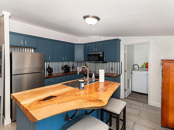 - Description: Stainless steel appliances, butcher block counter tops, live edge countertop kitchen island