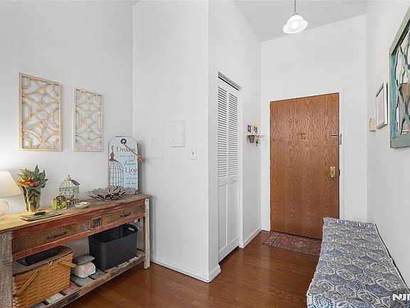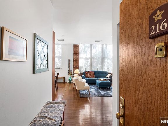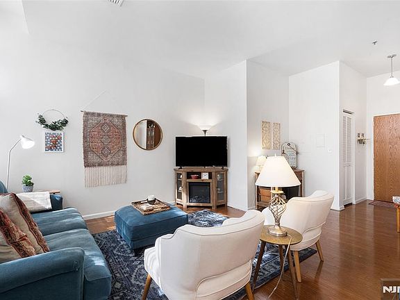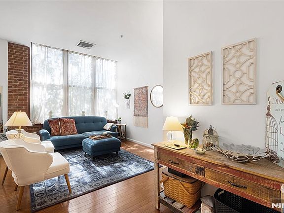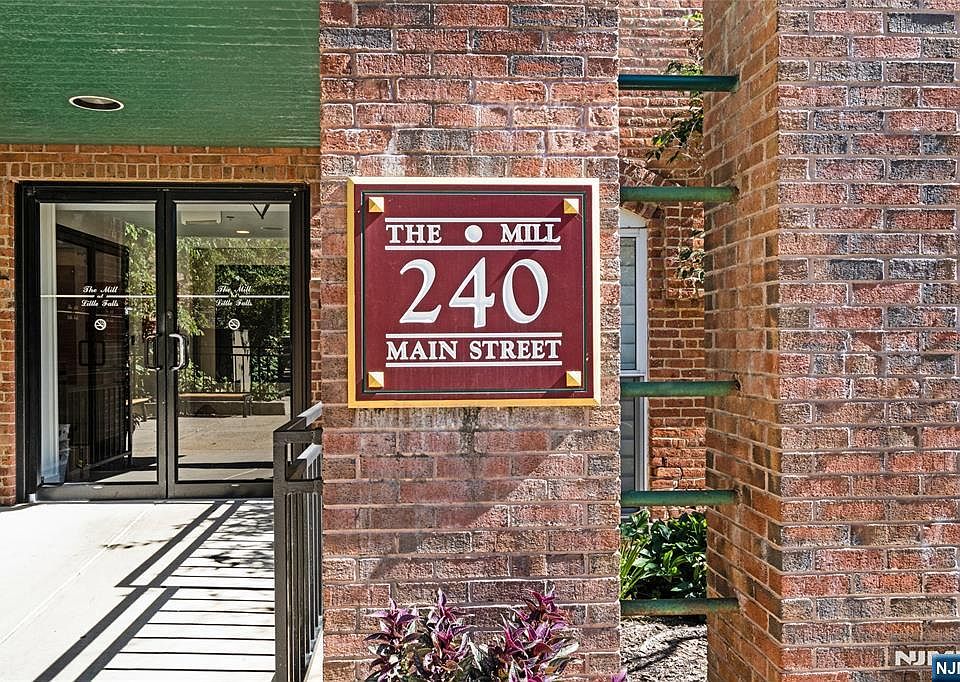 High ceilings and expansive windows define this two-bedroom residence at The Mill, where natural light draws attention to exposed brick, hardwood floors, and the seamless flow of the main living space. The renovated galley-style kitchen features crisp white cabinetry, wood-grain counters, a subway tile backsplash, and newer stainless-steel appliances. The primary suite includes a large walk-in closet with custom shelving and ample space for relaxation. A second bedroom, ideal for guests or a home office, enjoys high ceilings and abundant storage. Two full bathrooms provide modern convenience for everyday living. Additional highlights include plentiful closet space, and the ease of an in-unit washer and dryer. The Mill offers top-notch amenities, including a fitness center, community room, tennis courts, a pool, and walking trails. Relax on the "plaza deck" overlooking the waterfalls or stroll to nearby shops and restaurants. Leave your car in the covered garage parking space when you enjoy the easy NYC and Hoboken access via train or bus, this location is a commuter's dream.