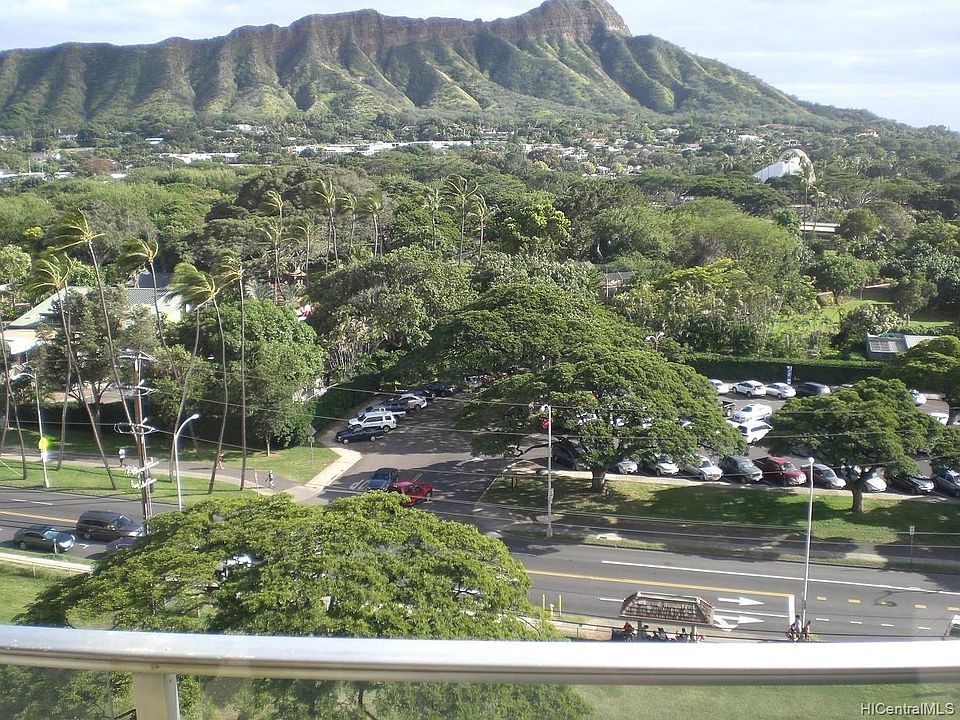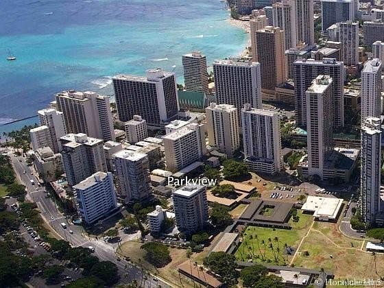 Diamond Head and Ocean Views. 10th floor corner view 2/2 with (1) garage parking stall. Parkview is near the corner of Kuhio and Kapahulu, next to Jefferson Elementary. Excellent Waikiki Location, with easy walking distance to Ocean, Park, Zoo, Aquarium, Restaurants, Shopping, and More. No pets, no smoking. Vacant, and freshly painted.