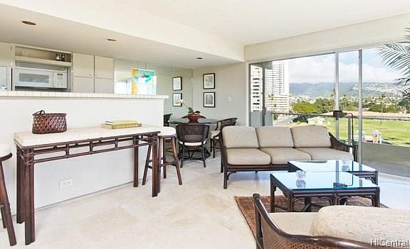 Fully furnished bright and cheery 2 bedroom + a den, 2 bath, with 1 assigned/covered parking stall at Parkview. Great location in Waikiki. Just steps to the beach, zoo, and Waikiki Shell for events and concerts. Open the large sliding glass doors for an outdoor feeling in your own living room with Diamond Head just outside and beautiful city and mountain views. Step out to the balcony and take in all the beauty and activities. Washer/dryer in the unit, window blinds, and central air conditioning. Includes water/sewer, and basic cable. Secured building with a pool. Minimum 12 months lease term. No pets, no smoking. Contact Sachi Hawaii Pacific Century Properties LLC (808) 596-9258.
