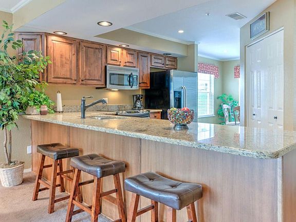 Elegance & Style will describe this beautifully updated fully furnished walk-in condo (no stairs!!). Warm accents, granite counter tops, stainless steel appliances, and new cabinetry through out. Sit in your spacious screened in patio overlooking a beautiful water feature and enjoy the view. To top it off the location is perfect, short drive to the 76 Strip, or Moonshine Beach!